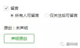 微信认证帐号的运营者登录平台后,在写文章时,运营者可声明某篇文章为原创文章,并设置文章是否允许留言。